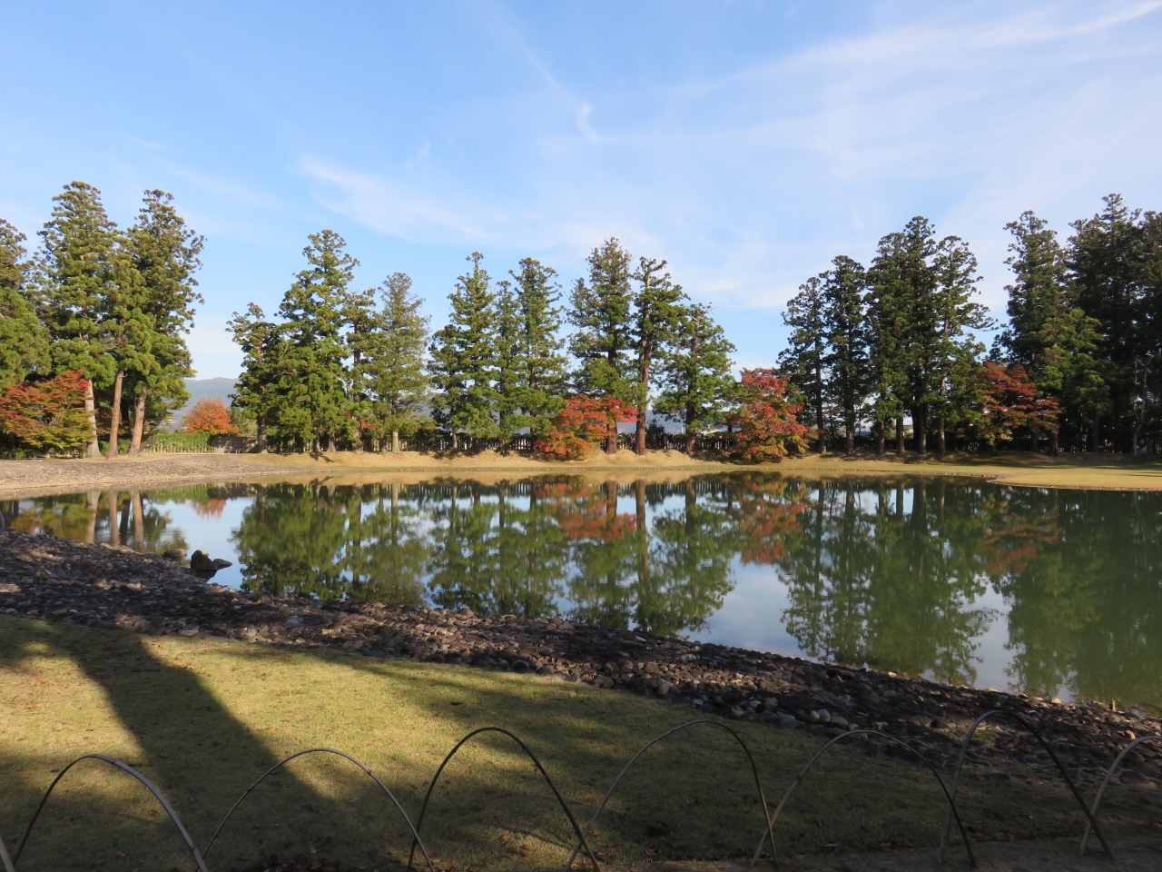 池は東西約180メートル、南北約90メートルあり、作庭当初の姿を伝えています。
