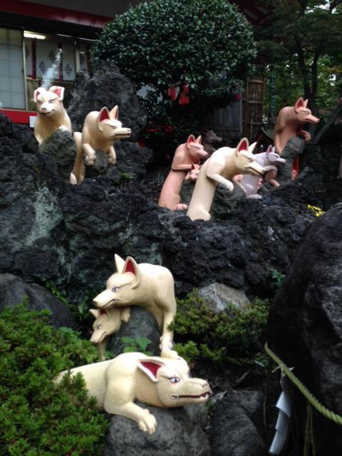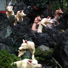 境内には、写真のように108体のお狐様がいらっしゃいます。また、竹生島弁才天を祭祀している「招福池」や、神様が鎮座したとされる「ときわ磐座」などがあります。
