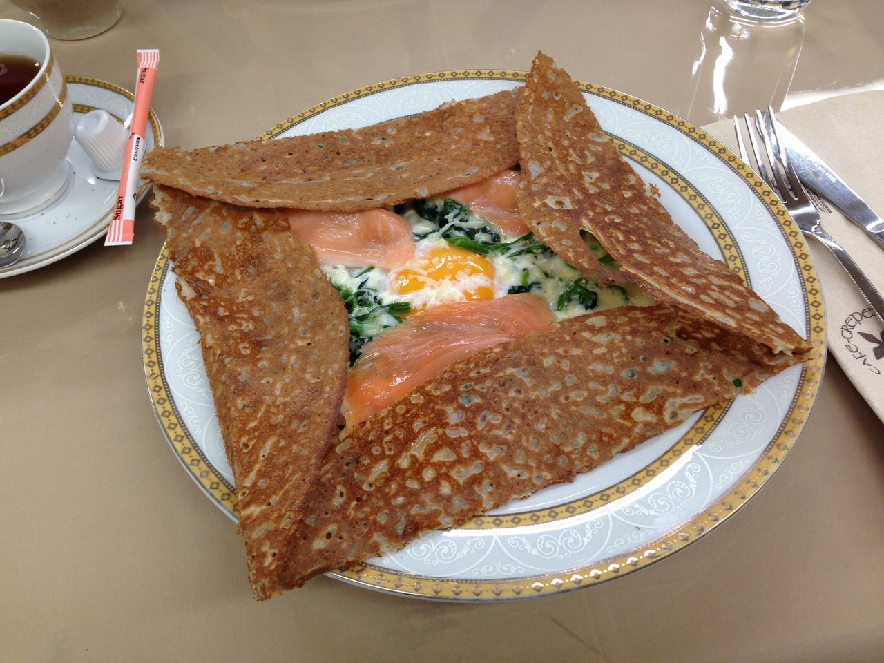 大混雑で30分まって入店。作りたてのカリカリモチモチと鮭とホーレン草と卵が絶妙でした。薄いけどたっぷりだからお腹いっぱい!