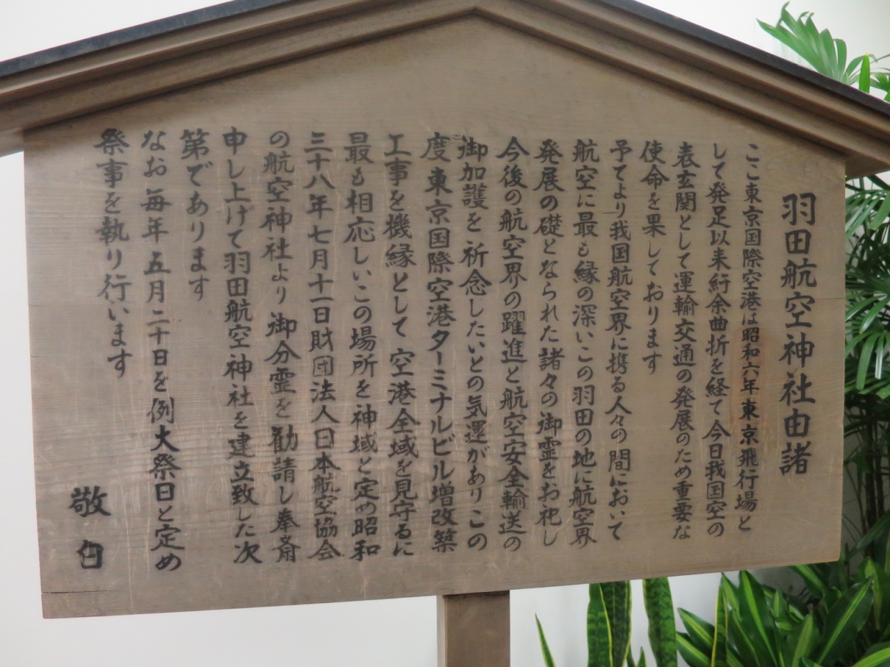 日本の航空業界に尽力された御霊をお祀りした神社で、自分はいつも帰国後に感謝をしに行く。(乗り継ぎ時間に余裕がある場合。) 観光としては、特別なモノではないが、なんとなく寄ってしまう。場所は第1ターミナルビル、エアポートラウンジ中央を出て右手奥にある。