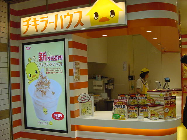 多くの観光客でにぎわう、東海道本線の新大阪駅の駅ナカにある「エキマルシェ」に入るチキンラーメンのショップです。私は幼い頃からチキンラーメンの大ファンだったので、店構えを見ただけでワクワクするのですが、チキンラーメンソフトクリームだけはかなり衝撃でした。