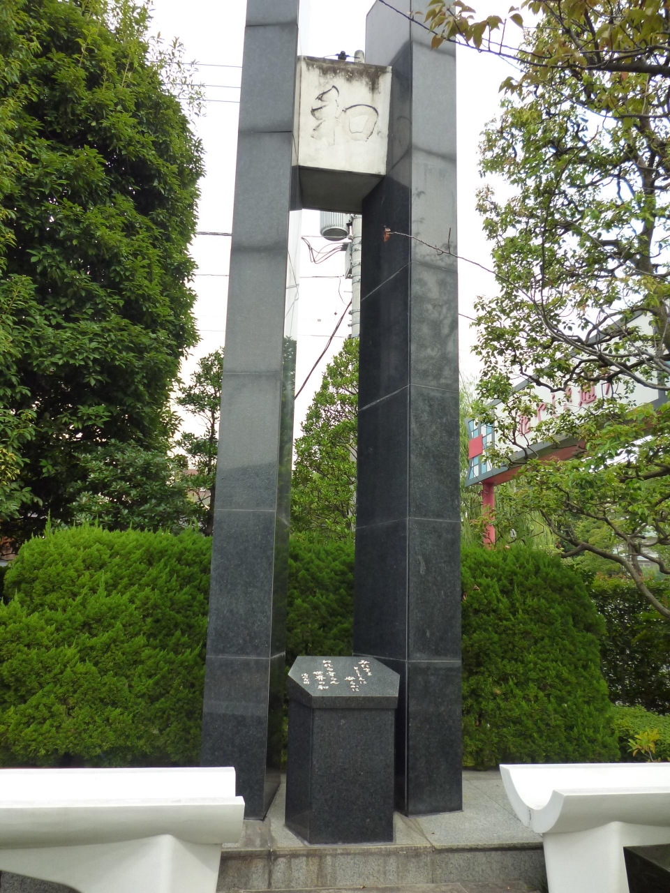 浅草寺の近くに大きな平和を願う塔がありました。浅草地区3万人余の戦災殉難者の霊をまつっています。台座には、湯川秀樹氏の直筆で「みたまよ、とこしえに、安らかに、われら守らん、世界の輪」の言葉が刻まれていました。