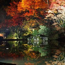 霞ヶ池ほど有名ではありませんが、こちらも紅葉がとても綺麗で、ちょうどライトアップされている時期に行ったので、池の水面に鏡のように紅葉がうつりこんで、とても素敵な雰囲気でした。
