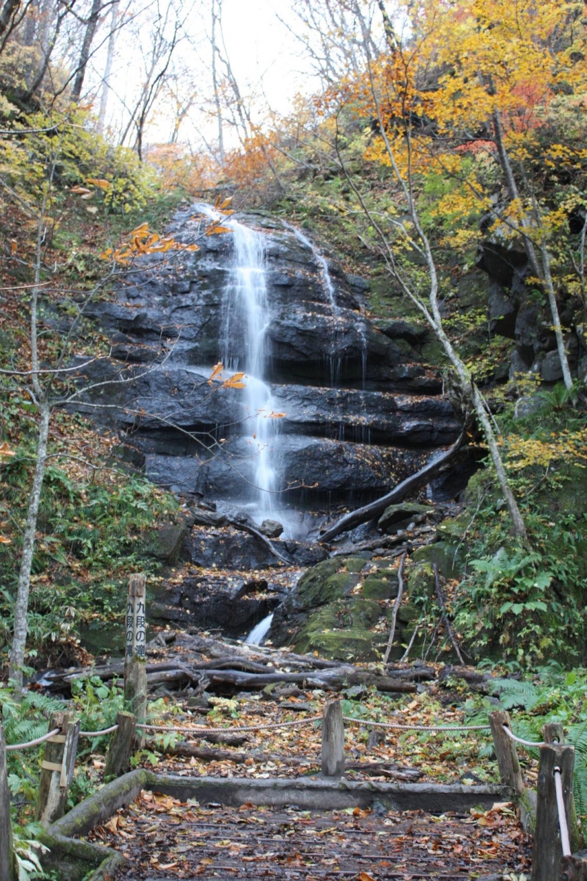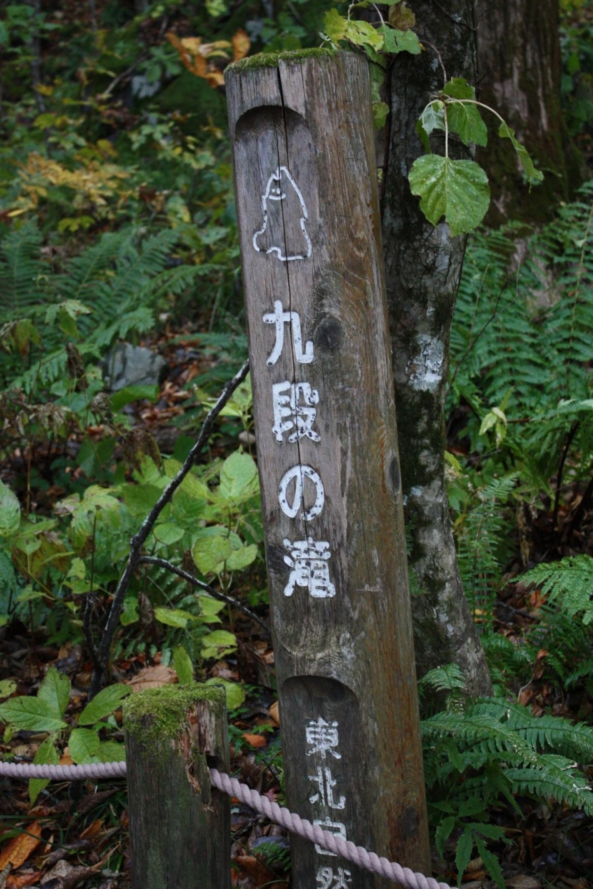 銚子大滝から遊歩道を歩いてくると有ります。断層が有りそこに滝の流れが当たって9段と言うことでしょうか?水量が少ないと色んなところにあたりながら流れるので9段以上あるかと思います。いずれにしても、あまり見かけないタイプの面白い滝だと思います。