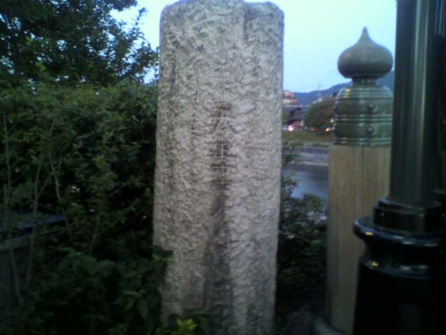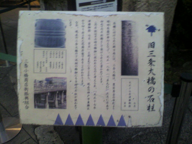 三条大橋は、豊臣秀吉の命で天正18年(1950年)に日本で初めての石柱橋として架けられた橋だそうです。その三条大橋の西詰に「旧三条大橋の石柱」がおいてあります。