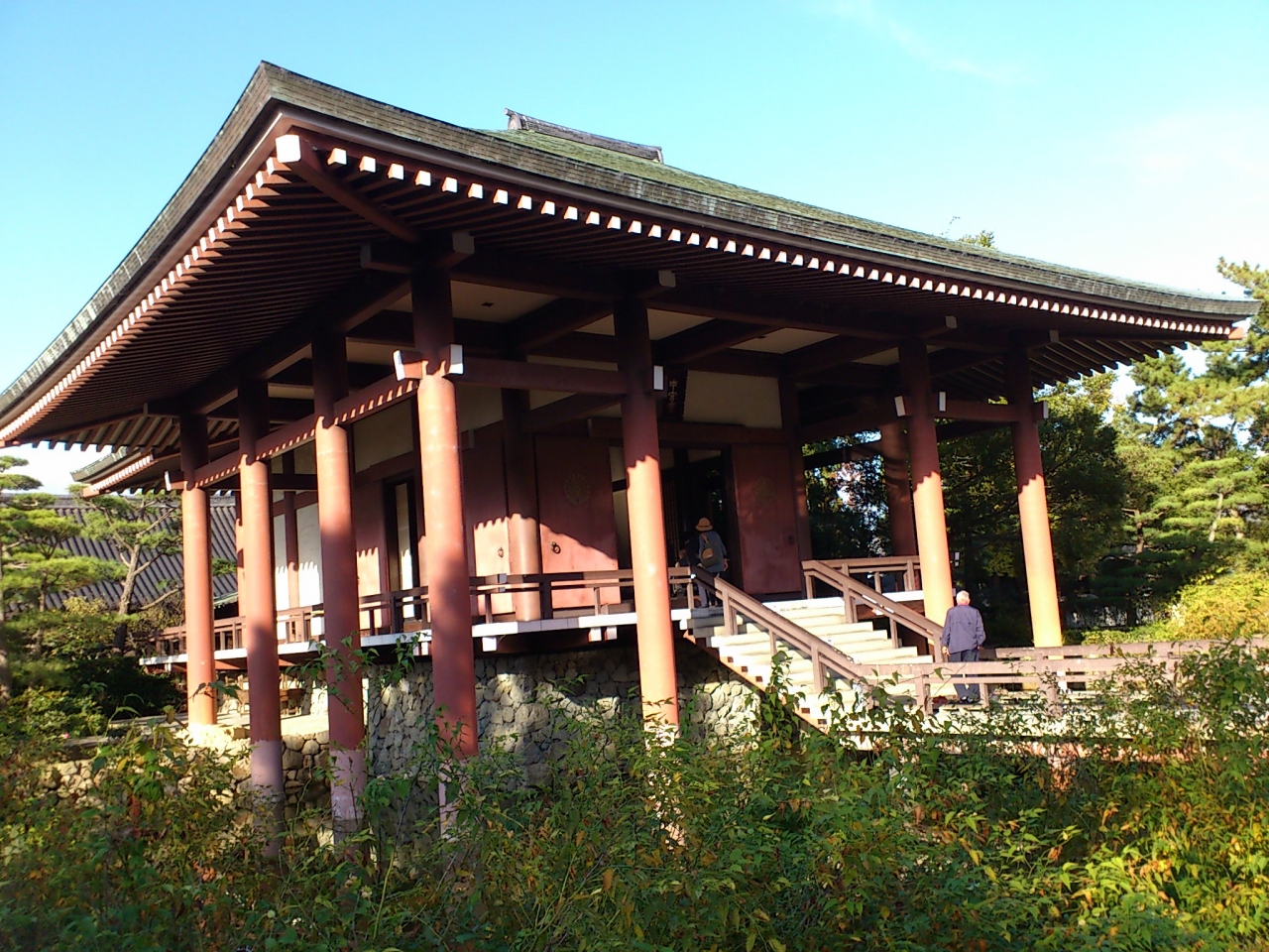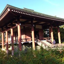 法隆寺の夢殿を拝観して外に出てみると、中宮寺へと言う看板が目に入ったので、そのまま進んで行くと中宮寺への入口がありました。元々は斑鳩御所があった場所で、聖徳太子の母親の中宮さまが開かれたお寺だそうです。お堂の前は池のような場所になっている、珍しい形をしています。