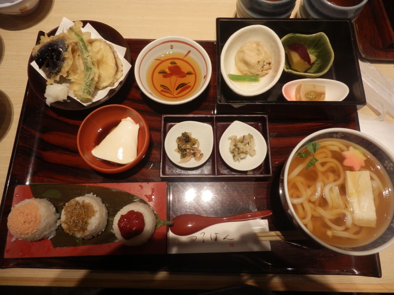 おうどんのメニューが多いです。単品もありますがセットメニューも多いです。見た目より意外にお安い。私は花??を注文しました。3色おにぎり、ごま豆腐、がんも、半うどん、天ぷらなど少しずついろいろいただけます。デザートのプリンもついています。(豆腐かと思いました)