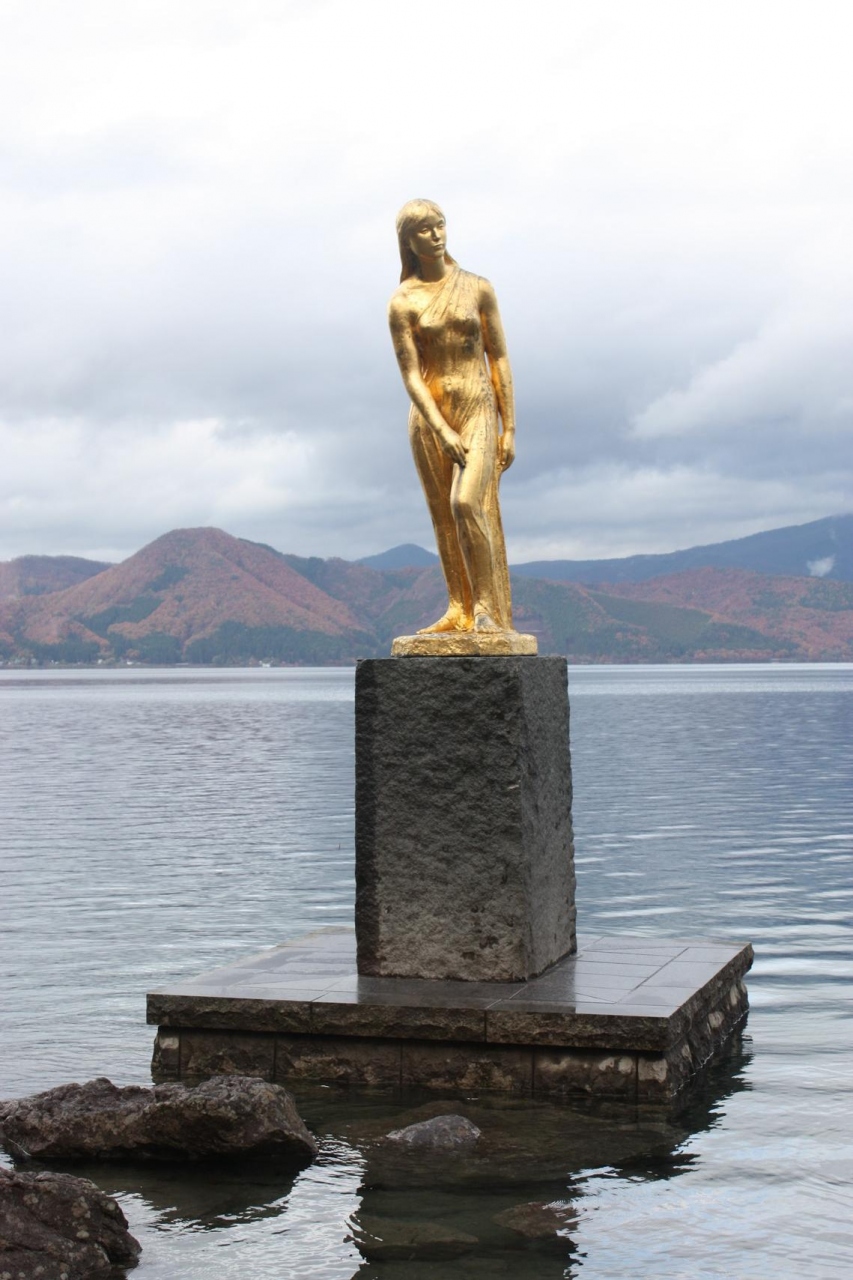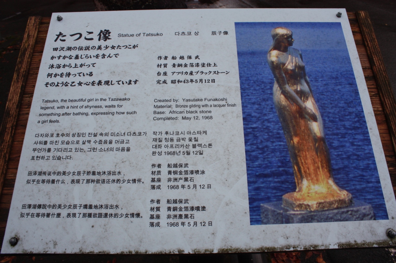 たつこ像を求めて車を走らせましたが、途中から案内板が無くなり不安になりましたがコーナーを曲がった時に湖に金色の像が突然現れました。周囲に小さな土産物屋は有りますが、無料の駐車スペースが無く、皆さん路上駐車されていました。道路側からは上から目線で見えますし、下に降りると見あげる感じで眺めることができます。