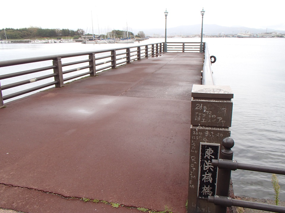 西波止場の北海道第一歩の地碑のすぐ隣に小さな桟橋がございまして、そちらに東浜桟橋の札がかかっておりました。