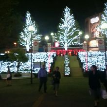 10万球の白や青や赤、シャンパンゴールドのLEDやミラーボール、サーチライトを使っており、それらを木々や植え込み、公園の柱や階段にひきつめています。