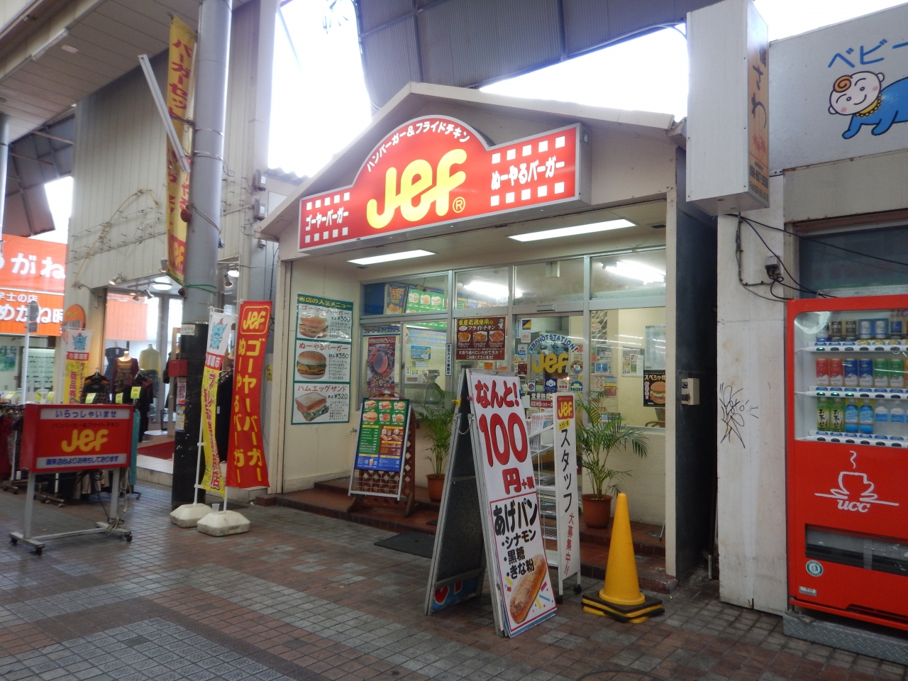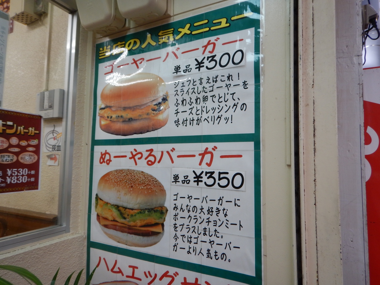 国際通りから、市場中央通り、その先の新天地市場通りを行き、太平通りの看板が見えたら、その角を左に曲がると、サンライズなは通りになります。沖縄銀行の近くに Jef サンライズなは店はありました。ゴーヤーバーガー(ゴーヤーの卵とじ入り)とぬーやるバーガー(さらにポークランチョンミートも入っている)が人気です。あげパンも100円でシナモン、黒糖、きなこ味がありました。