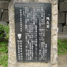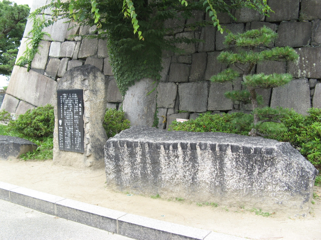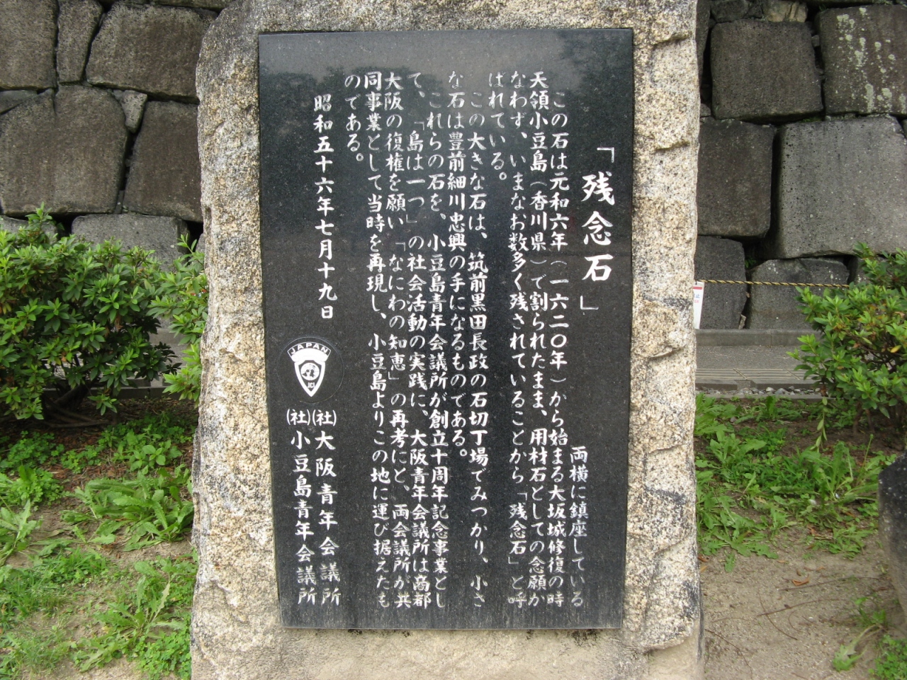 天守閣入り口のすぐ左側にあります。傍にある説明板によると『この石は元和六年(1620年)から始まる大阪城修復のとき天領小豆島(香川県)で割られたまま、用材石としての念願がかなわず、今なお数多く残されていることから残念石と呼ばれている。』とあります。恐らく運搬中に落としてしまい、“落とす”が“落城”に繋がり縁起が悪いために使われることなく放置されたのでしょうが、名前の付け方が面白いと思いました。