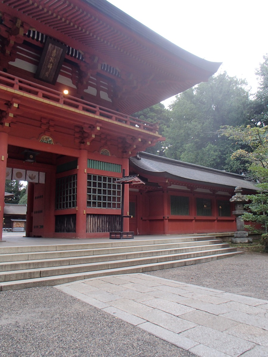 本殿の黒を引き立てる朱塗りの楼門で、立派な額に書かれた「香取神宮」の文字を見上げると、改めて屋根の大きさに圧倒されます。