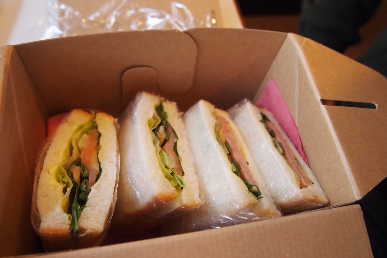 サンドウィッチはスパムとサーモンの2種類。お野菜もたっぷり入っていて満足度高し。