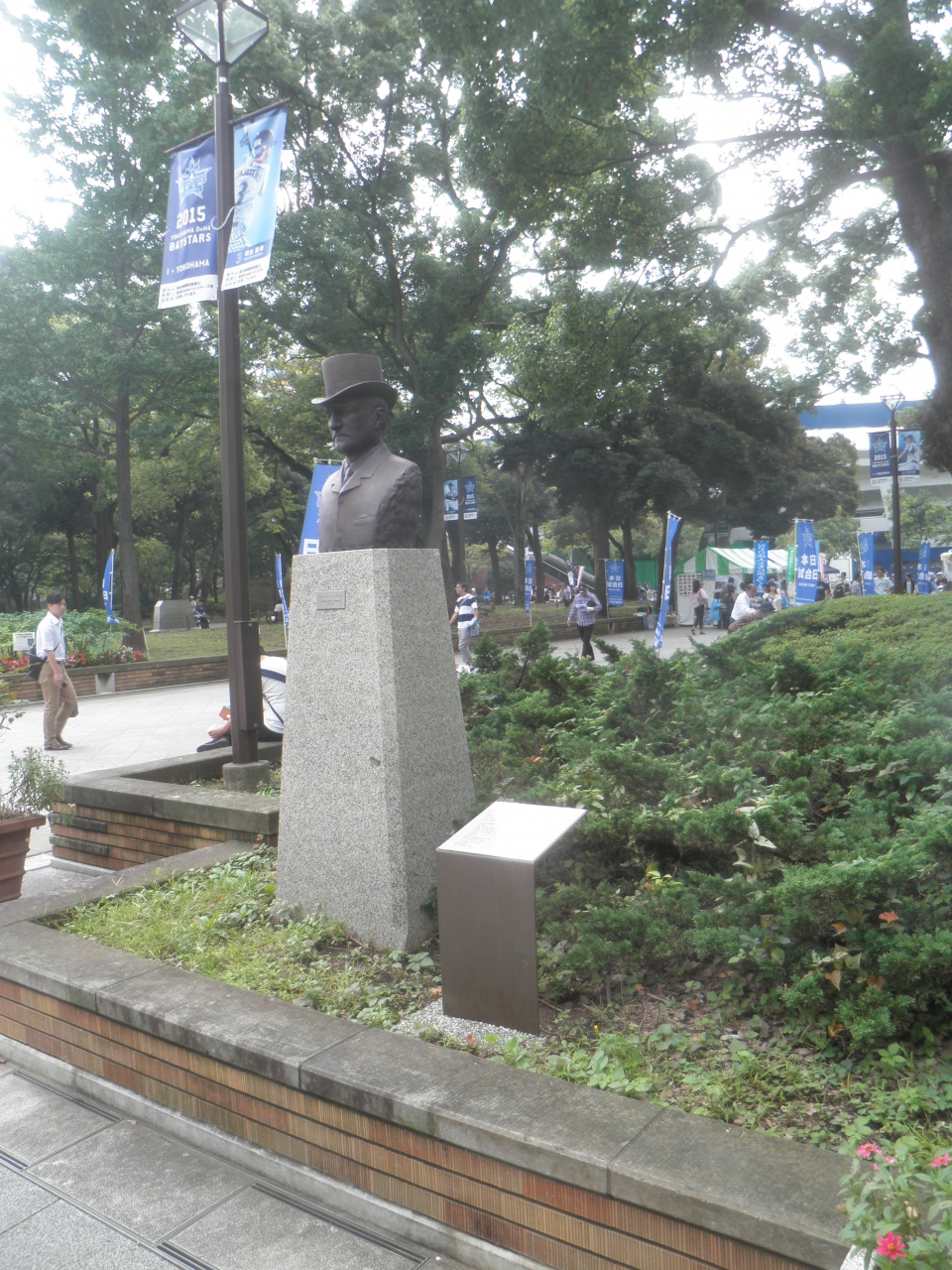 明治時代に横浜の街づくりにたずさわった土木技師のブラントン氏の胸像が横浜公園にたっています。横浜公園は横浜DeNAベイスターズの本拠地横浜スタジアムとおなじ敷地にあり、日本大通りの近くです。 シルクハットをかぶった外国人らしい像です。