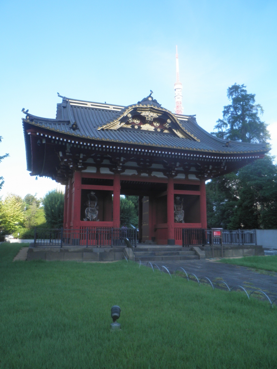 都営地下鉄の芝公園駅から増上寺に行く途中にある赤い門が見えました。門自体はそれほど大きくはないのですが、両側にある仁王像が大きくみえます。迫力のある像でこちらに飛び出してきそうに見えます。 門の後ろには東京タワーがみえます。