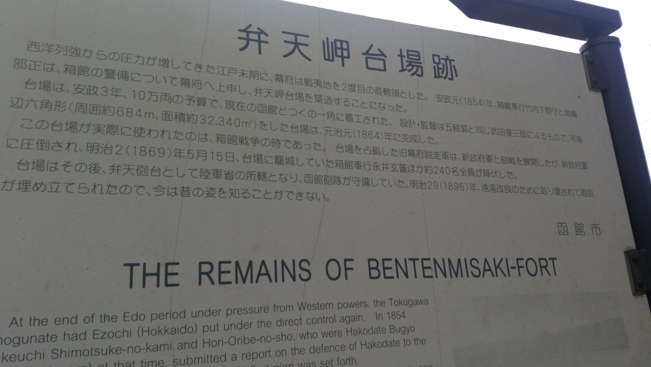 函館市の外れ、市電の「函館どっぐ前」電停の向かい(南側)の公園にひっそりと「新撰組最期の地」の碑と弁天岬台場の説明看板があります。