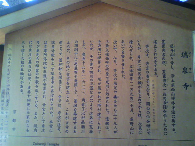 塚が築かれ石塔もたてられるものの、鴨川の氾濫などで荒廃。高瀬川の開削をした角倉了以が墓石を発掘して、この地に堂宇を建立したことがこの瑞泉寺の起源のようです。