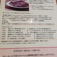 おすすめは「金沢カレー」。松任市にある老舗の洋食屋「キッチンユキ」のカレールーを使っているそうで、ルーは金沢カレーの中でも色が濃いめ。メニューにも「金沢ブラックカレー」と書いてあり、スパイスが効いていて濃厚な味。具はほとんど溶けていてとろみが強い感じ。金沢カレーのチェーン店とはちょっと違う味でこの味もおすすめです。