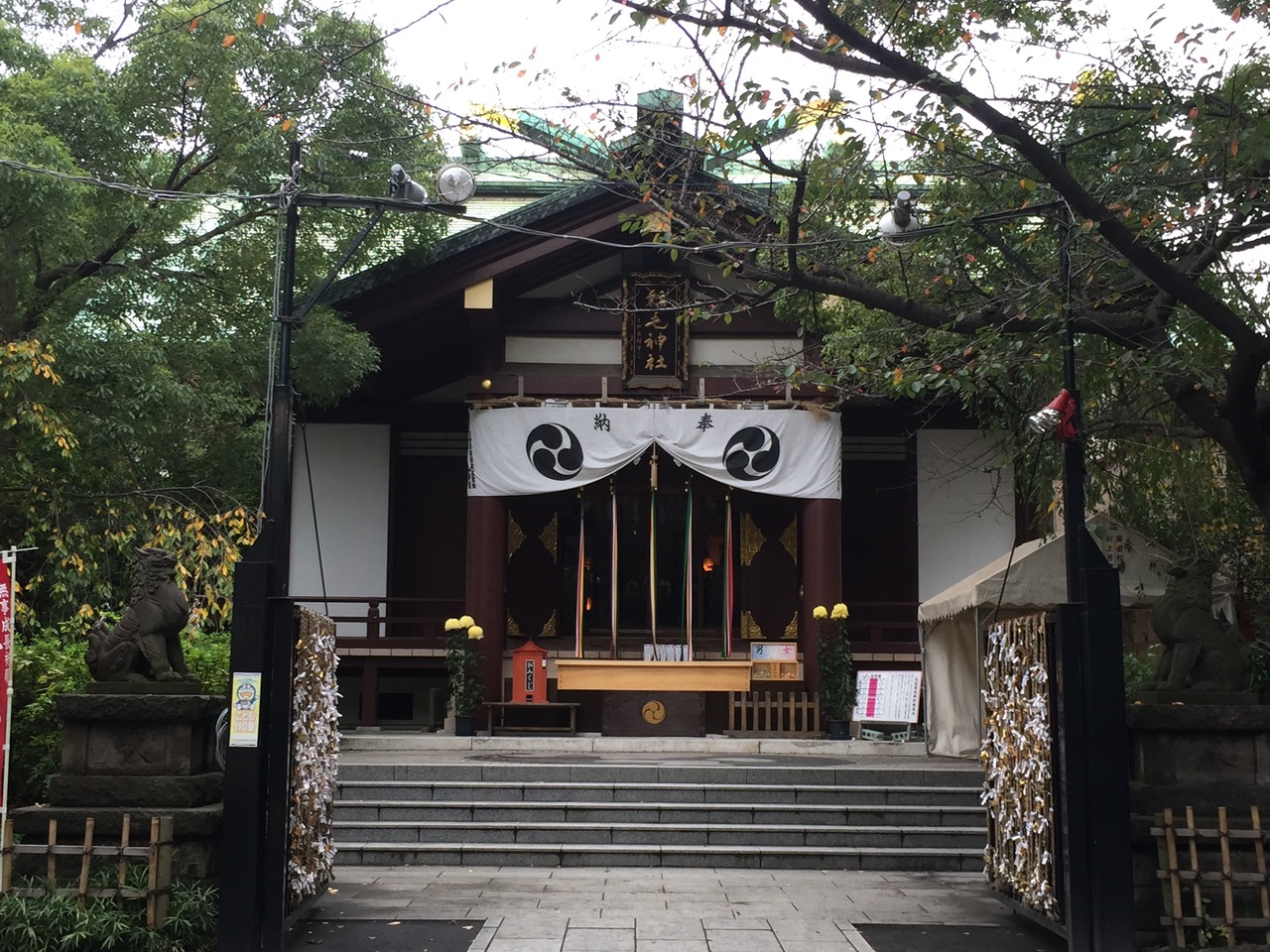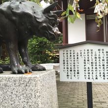 川崎駅から向かって、川崎市役所を過ぎてさらに左奥側の第一京浜沿いにあります。大きな鳥居には言われがあるようで、説明書きがありました。また、本殿の手前には「天地睨みの狛犬」が鎮座しており、上半身に関するお願いは右側の狛犬を撫で、下半身については左側の狛犬を撫でてから参拝すろようにとこれも説明書きがありました。