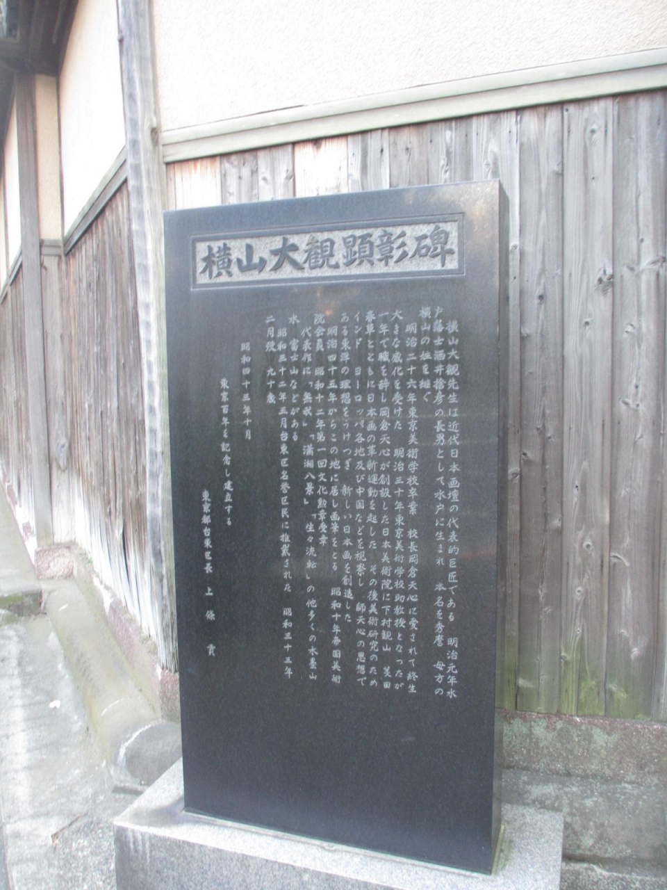 不忍通りに面して不忍池と道路を挟んで反対側にある横山大観記念館の入口脇にこちらの顕彰碑はあります。会館が開いていない時間でも、こちらの顕彰碑はいつでも見ることができます。台東区が建立したようですが、特段の特徴のある碑ではないのが残念です。