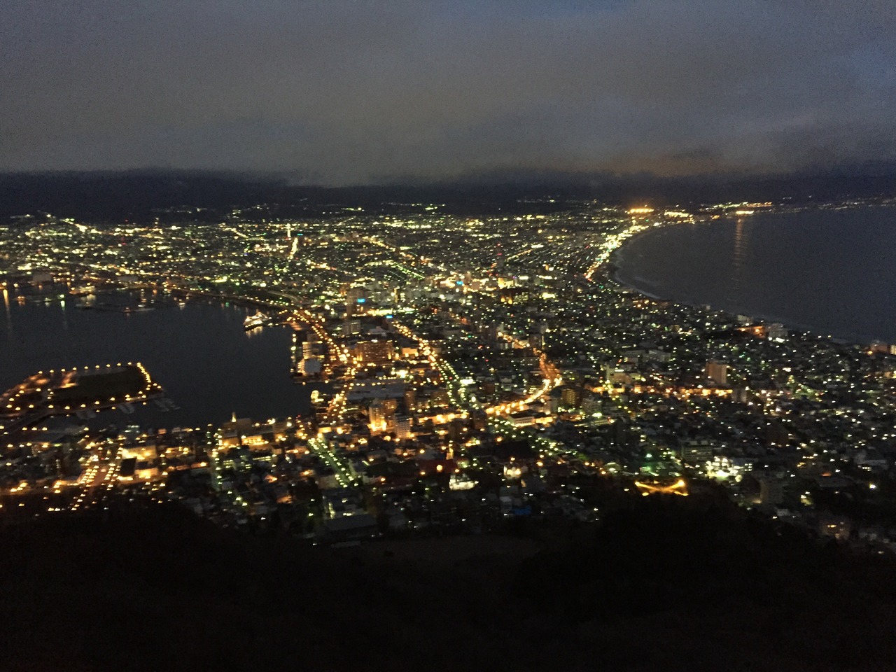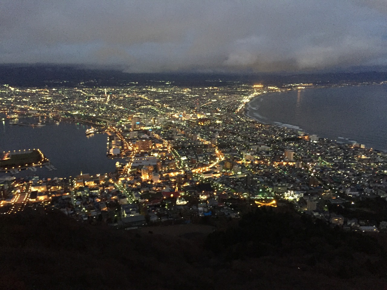 日没前(16:30くらい)に山頂に行きました。ちなみにケーブルカーはメンテナンス中で営業しておらず、タクシー利用。交渉して、ラビスタ函館ベイから山頂までの往復+山頂での待ち時間で4000円で行ってもらいました。山頂は中国人観光客でいっぱいでしたが、20~30分もすると徐々に減り、夜景も見やすくなりました。