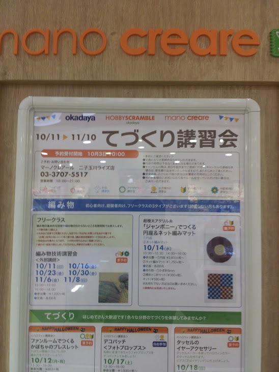 二子玉川ライズの6階にある手芸屋さん。店内はとても広いです。時期的にクリスマスグッズやマフラーを編む毛糸などが店頭の目立つところに出てきてました。ここは手芸教室などもやっているようで、時期的に編み物の教室の案内が出てました。