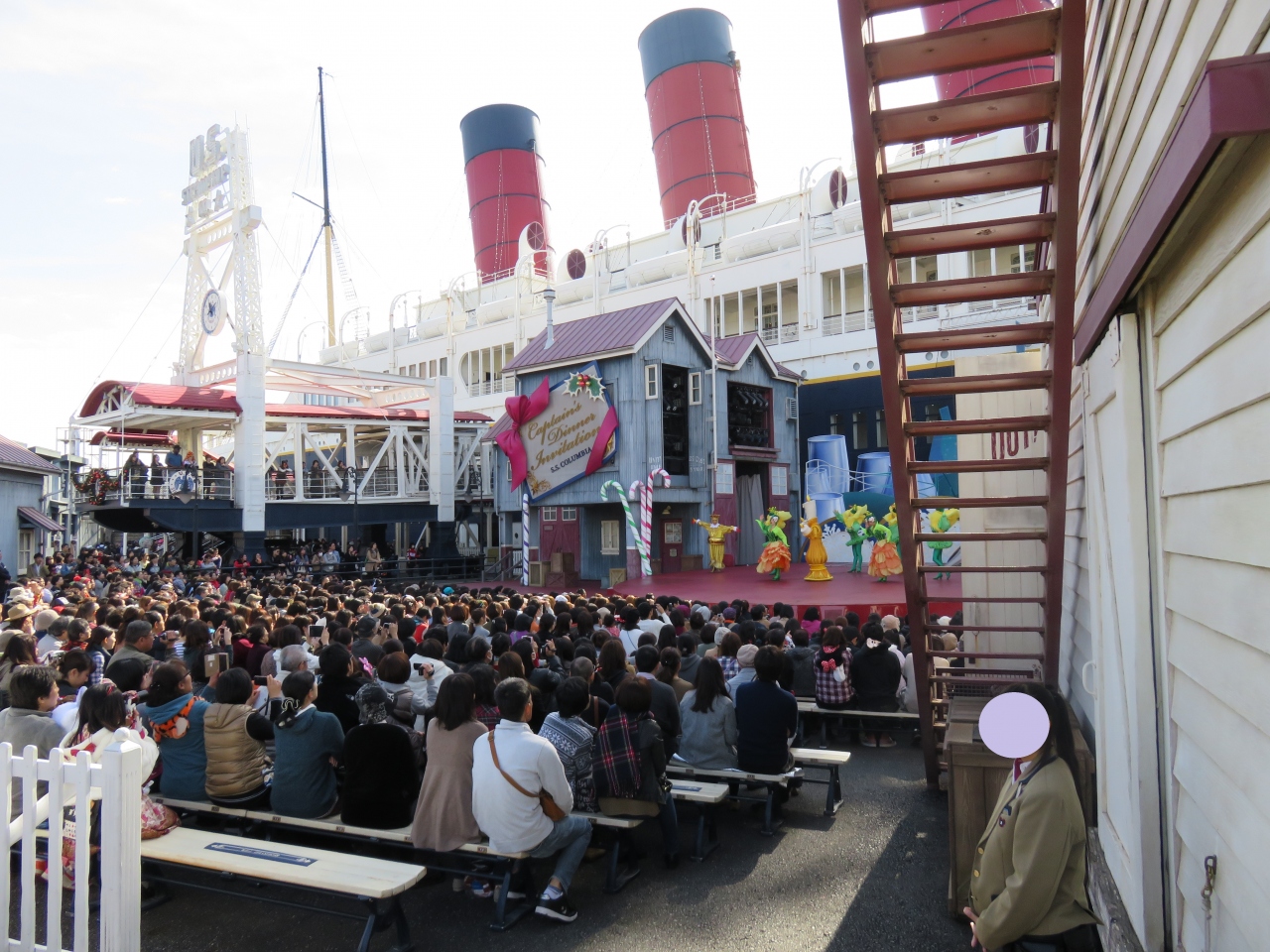 抽選では無いと聞き、中へ入ろうとすると11:10開演のシートは満席でプライオリティの席が少し残っているだけだった。 11時時点で右側に並んでいる人たちは12:40のショーを待っている人たちと。