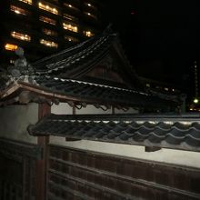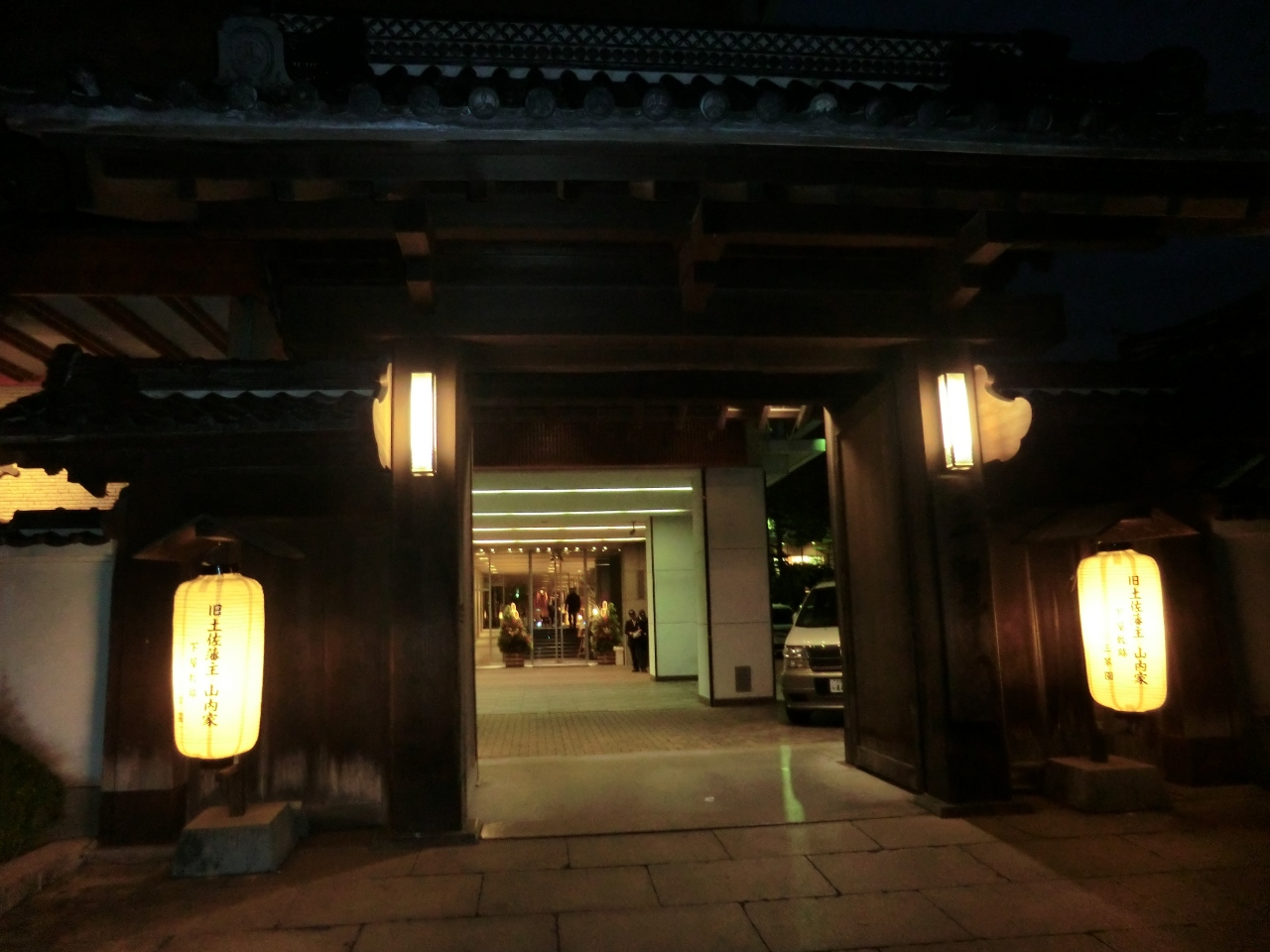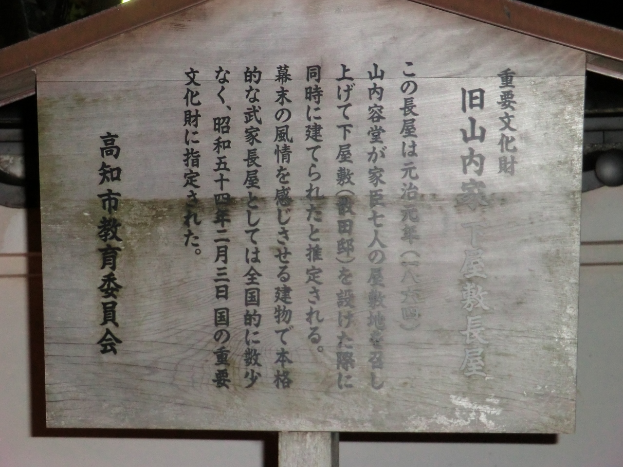高知城から大通りを渡り南へ10分程のところに「旧山内容堂の下屋敷」があります。幕末、土佐藩主であった山内容堂は、南御屋敷の東に隣接する武家屋敷七軒を召し上げて長屋を建てました。この時建てられた長屋が、旧山内家下屋敷長屋です。昭和53年、国の有形文化財に指定。大名の下屋敷内に建てられたものとしては、全国的にもめずらしいものだそうです。旧山内家下屋敷長屋は、ホテル三翠園の敷地内にあり、外壁の一部として利用されています。