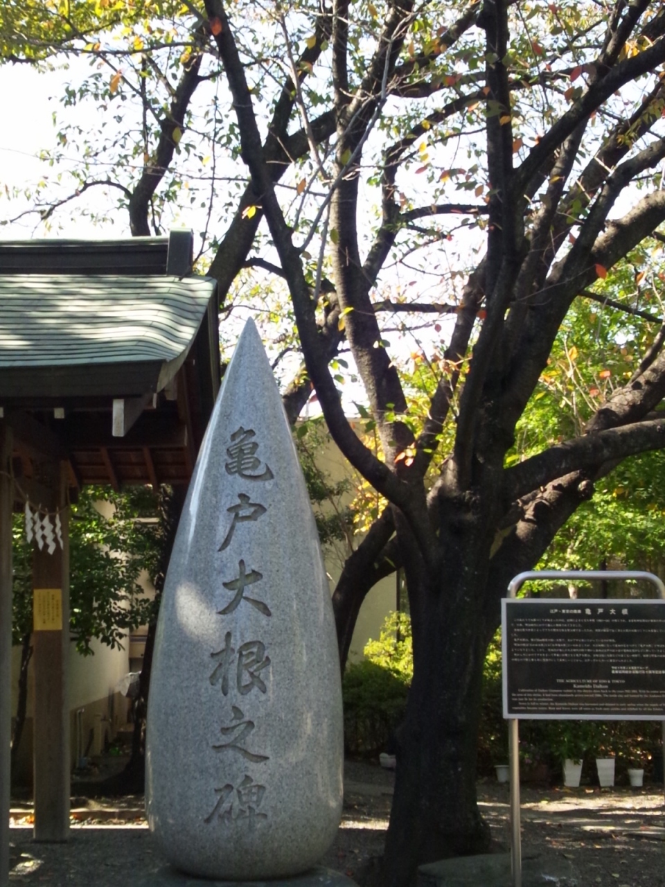 亀戸大根の碑が有って、木の後ろにスカイツリーが見えます!