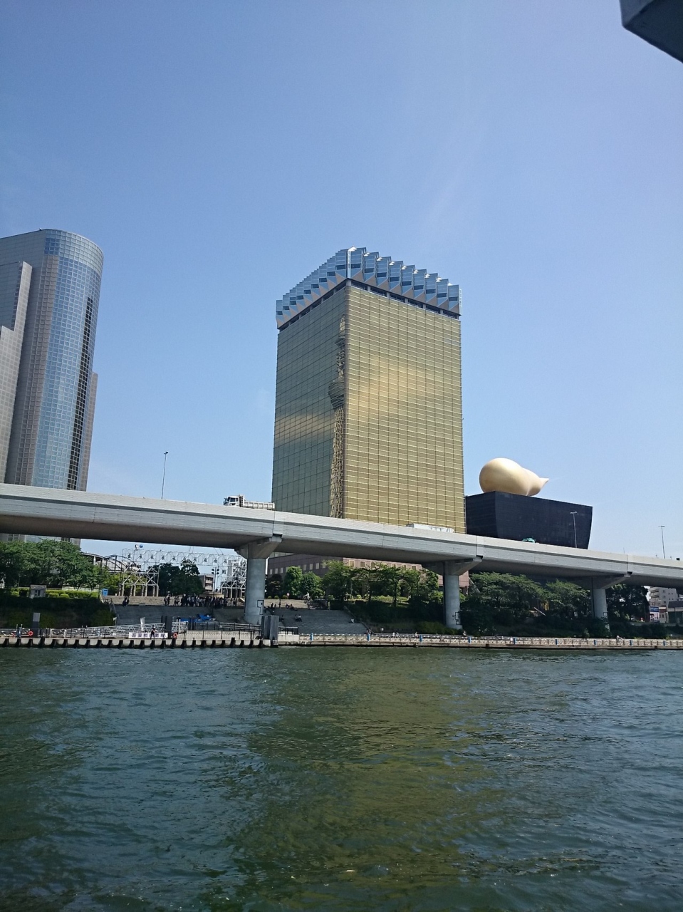 浅草に到着する直前に金色のアサヒビール本社ビルに映る金のスカイツリーを見せてくれるときもあります。(混雑具合なのか?見れない日もあります)