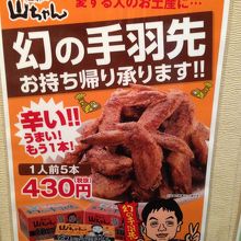 飲み始めるには遅い時間だったので手羽先だけを持ち帰りでオーダー、注文後7. 8分で出来上がりました。コショウの効いたスパイシーな手羽先を店舗外でも楽しめるのはいいです。お手拭きを付けてくれます。