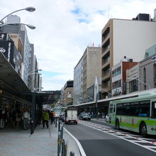 この四条通りは京都でもっとも賑わっている東西にのびるストリートで、いつも観光客や買物客でいっぱいです。買物では高島屋や大丸などの老舗の百貨店や付近には400年の歴史を持つ錦市場など、観光では八坂神社や南座、また祇園祭のメイン会場でもあり山鉾巡行の出発地点にもなっています。