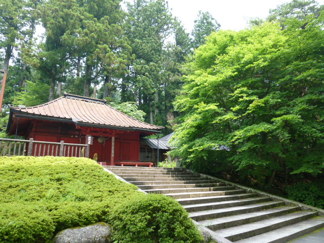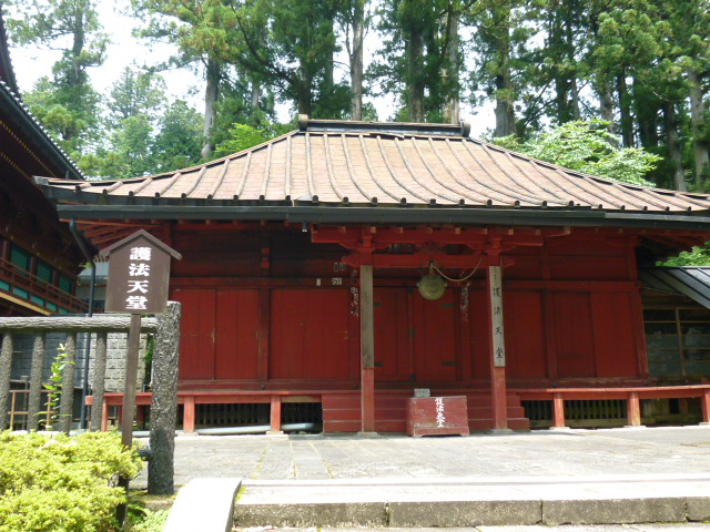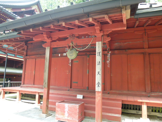 日光の社寺が世界遺産登録されて今年で17年を迎えました。国宝や重要文化財等の宝庫、東照宮へ向かう広い参道沿いに輪王寺があります。広い境内の三仏堂の裏側の木々に覆われた中に約400年前に建てられた国の重要文化財に指定されている護法天堂があります。こじんまりとした建物で外観は朱塗りで、寂しげな雰囲気でした。残念ですが内覧はできませんでした。ここにはご利益ある三天(毘沙門天や大黒天、弁財天)が祀られています。