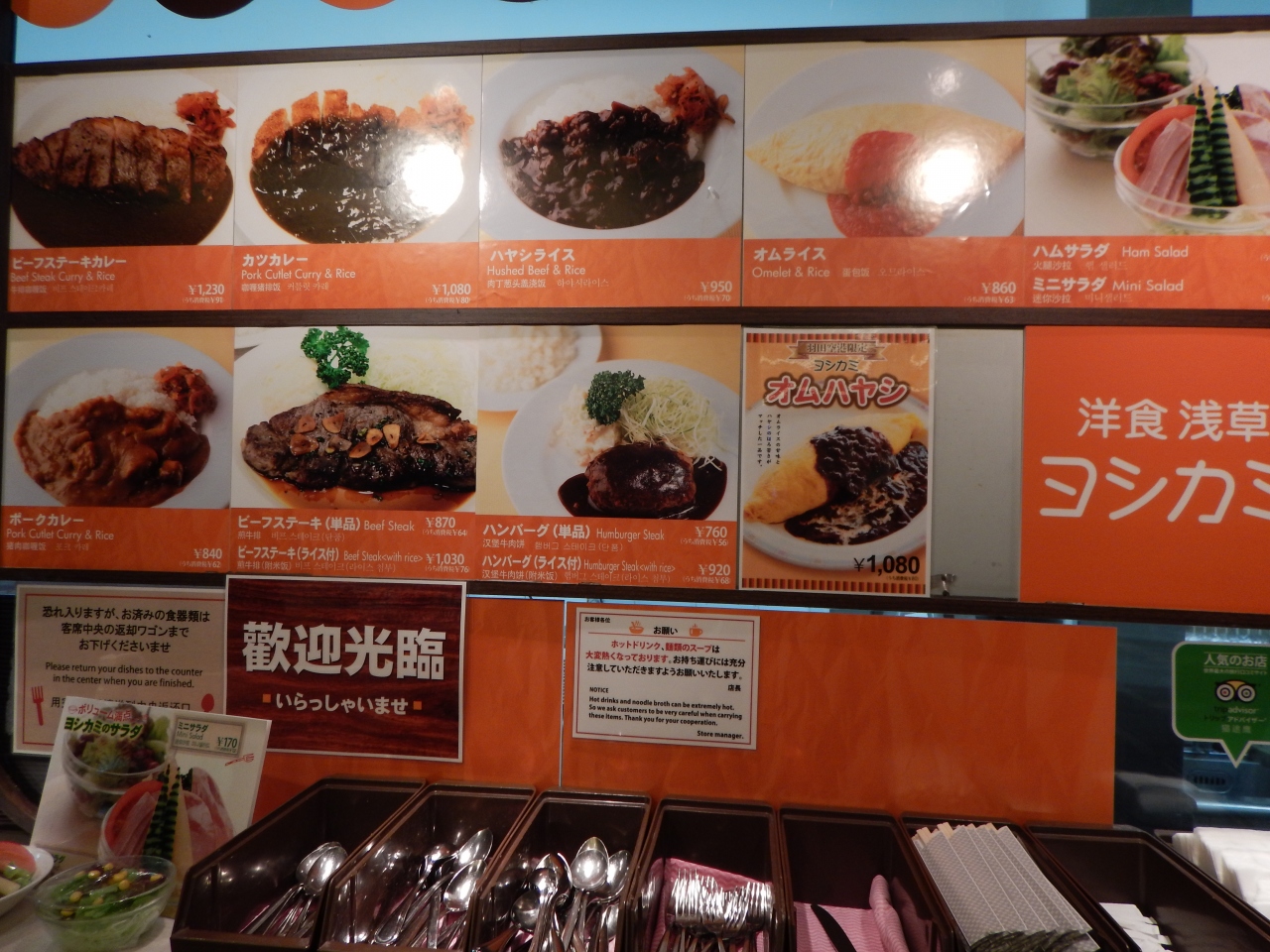 羽田空港第一旅客ターミナル 地下1階 フードコートの中にあります。「ヨシカミ」と言えば老舗有名洋食屋さんですが、フードコートで手軽に食べられるのはとても良いと思います。値段は1000円以内のものが多いので、あまり期待しすぎると、がっかりするかもしれませんが、普通に美味しかったです。