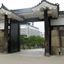 正面玄関にしては一見簡素に見えますが、扉表面全体に鉄板が張られ重厚な建造物になっていて、大手門を取り囲む土塀二棟とともに重要文化財に指定されています。