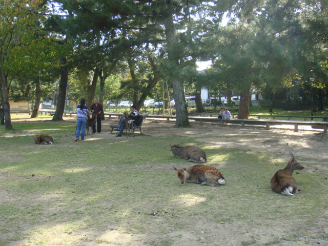 公園内外の至るところに鹿がいて面白いですが、10月の鹿は発情期で餌を持っている人にたくさんの鹿が寄ってきて危険です。特に沿道で売っている鹿せんべいをもっていると、勢いよく集まってきます。人なつこいのはよいですが、黒豆のようなフンが至る所に落ちていますので気をつけてください。昔吉永小百合さんが「奈良の春日野~」という歌を思いだしました。