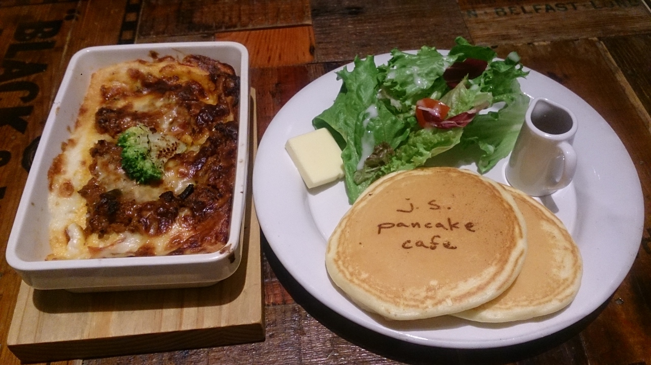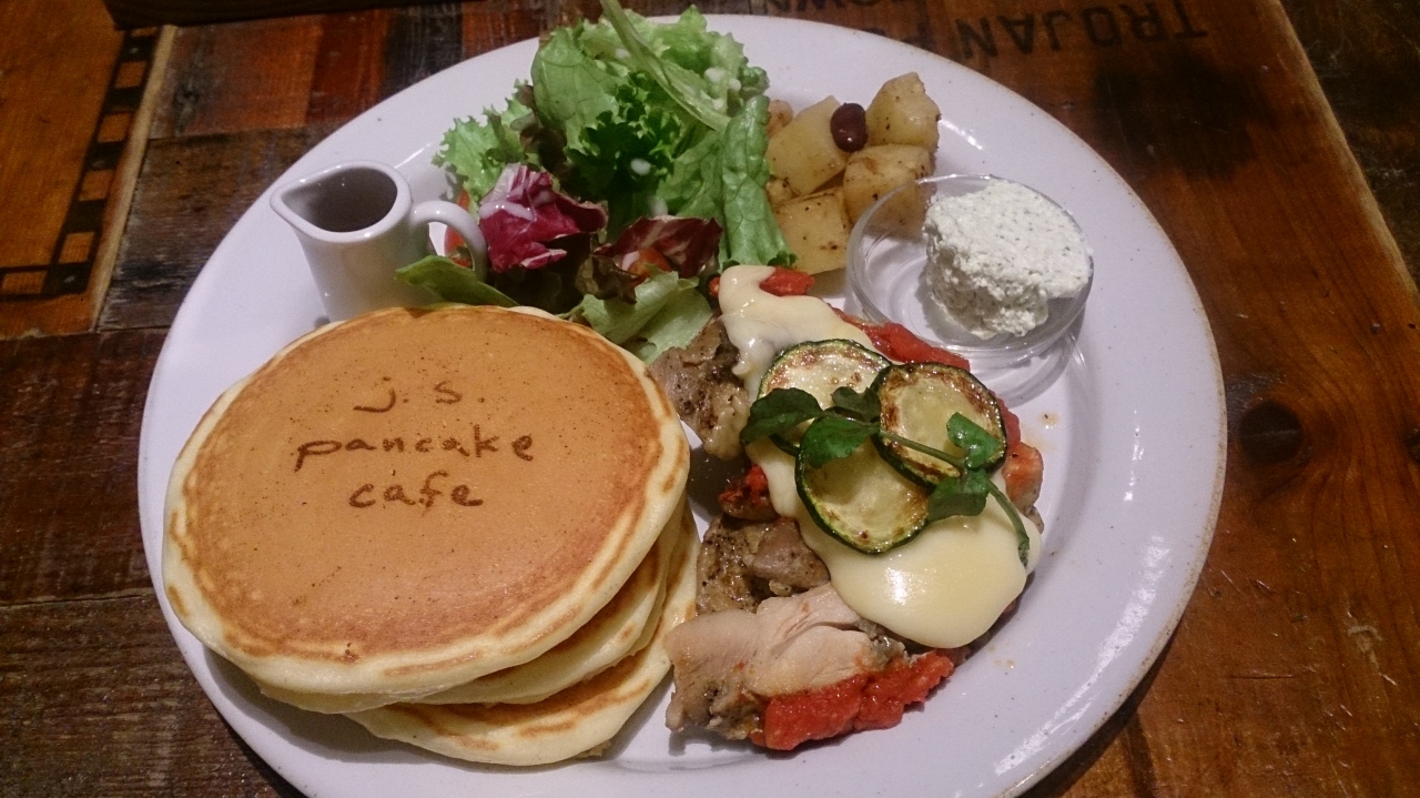 ミールパンケーキのメニューはおかずとパンケーキがワンプレートに。パンケーキは自体は甘くないので、シロップをかけなければパンの変わりになる感じがした。