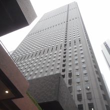 外観は茶色っぽい色で真四角ではなく台形のような形をしているビルです。