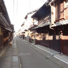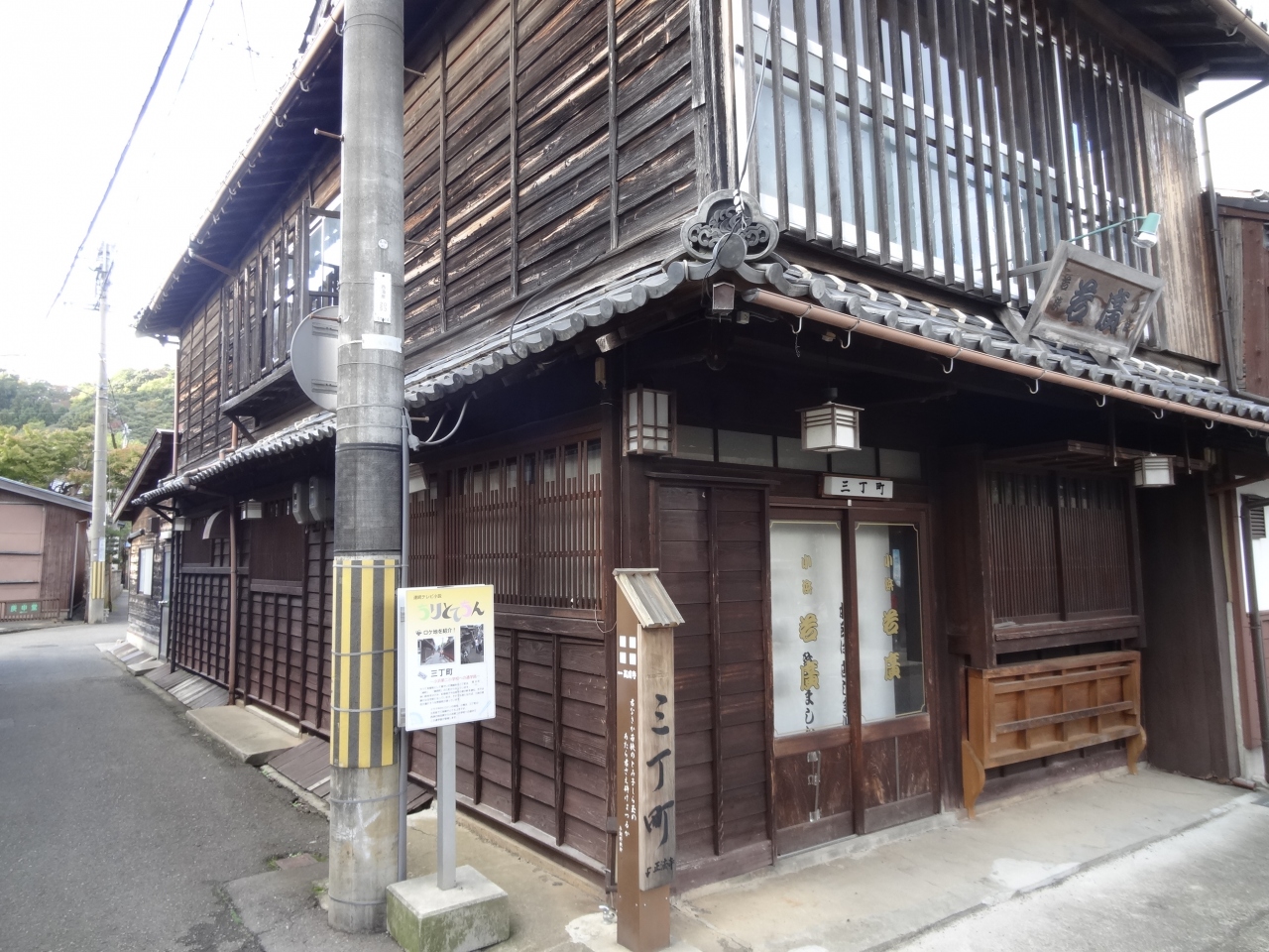 この町には、古い町並みが多く残されている。この三丁目のその一つで、かつての茶屋街がある。道は決して広くないが、いろいろな格子の家が軒を連ねている。面白いのは、飛騨地方で有名な、さるぼぼが魔除けの意味か各家の軒先につられていた。とても落ち着いた雰囲気の一角である。