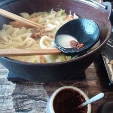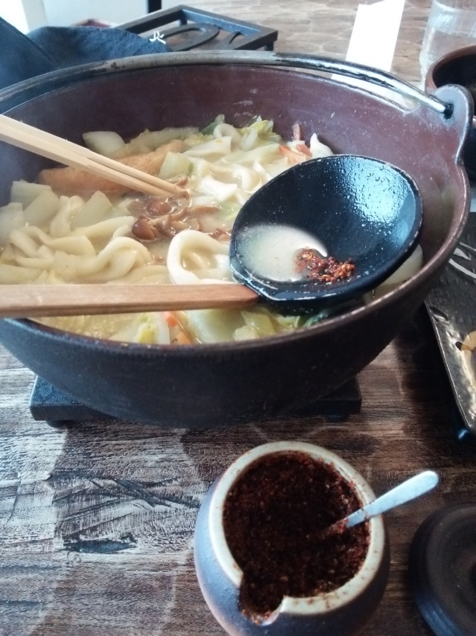 そして汁。これが絶妙に濃くもなく薄くもなく丁度いい。お好みで自家製七味みたいなのを混ぜて食べると、最後まで飽きずにたべれます。