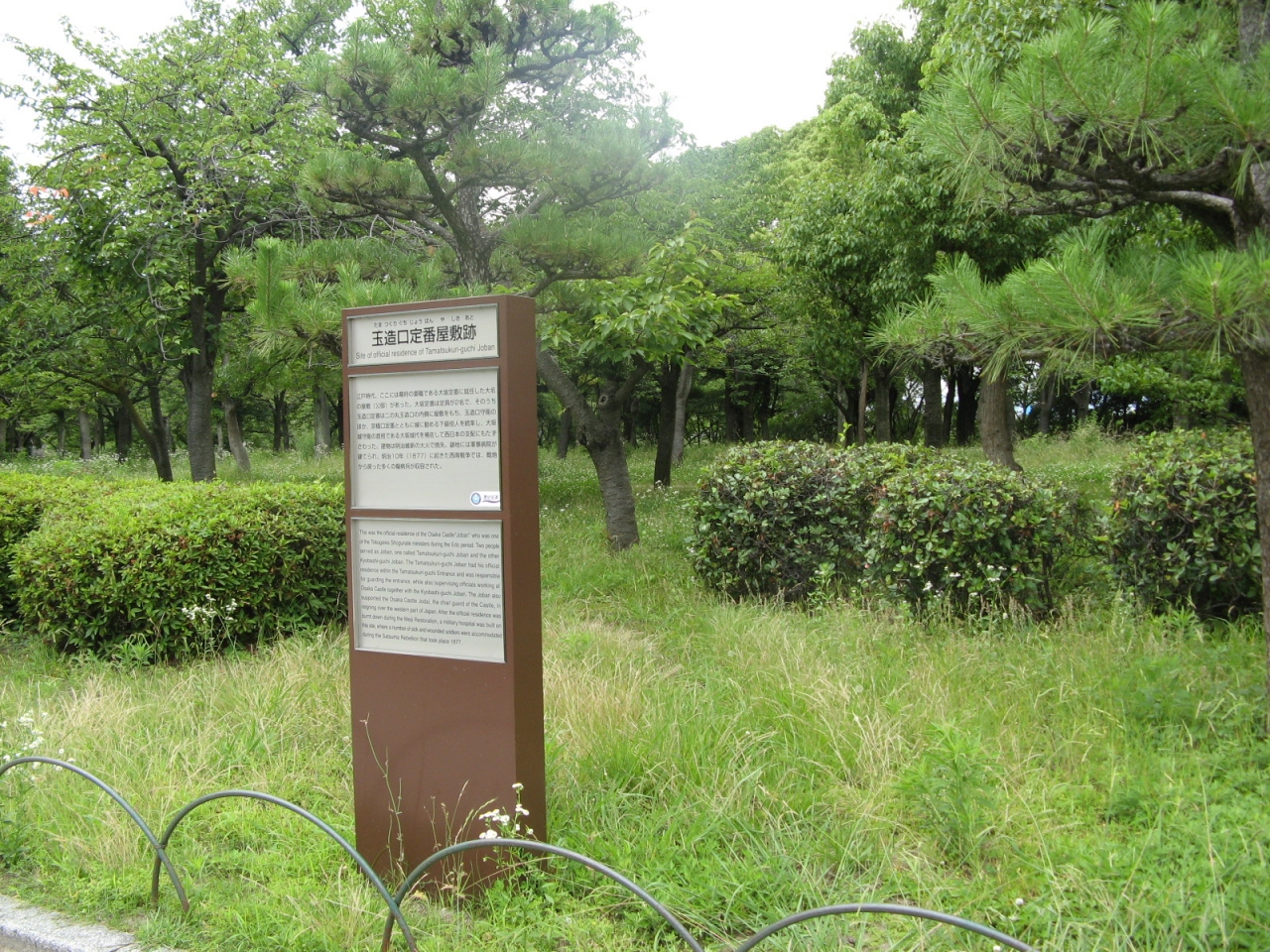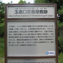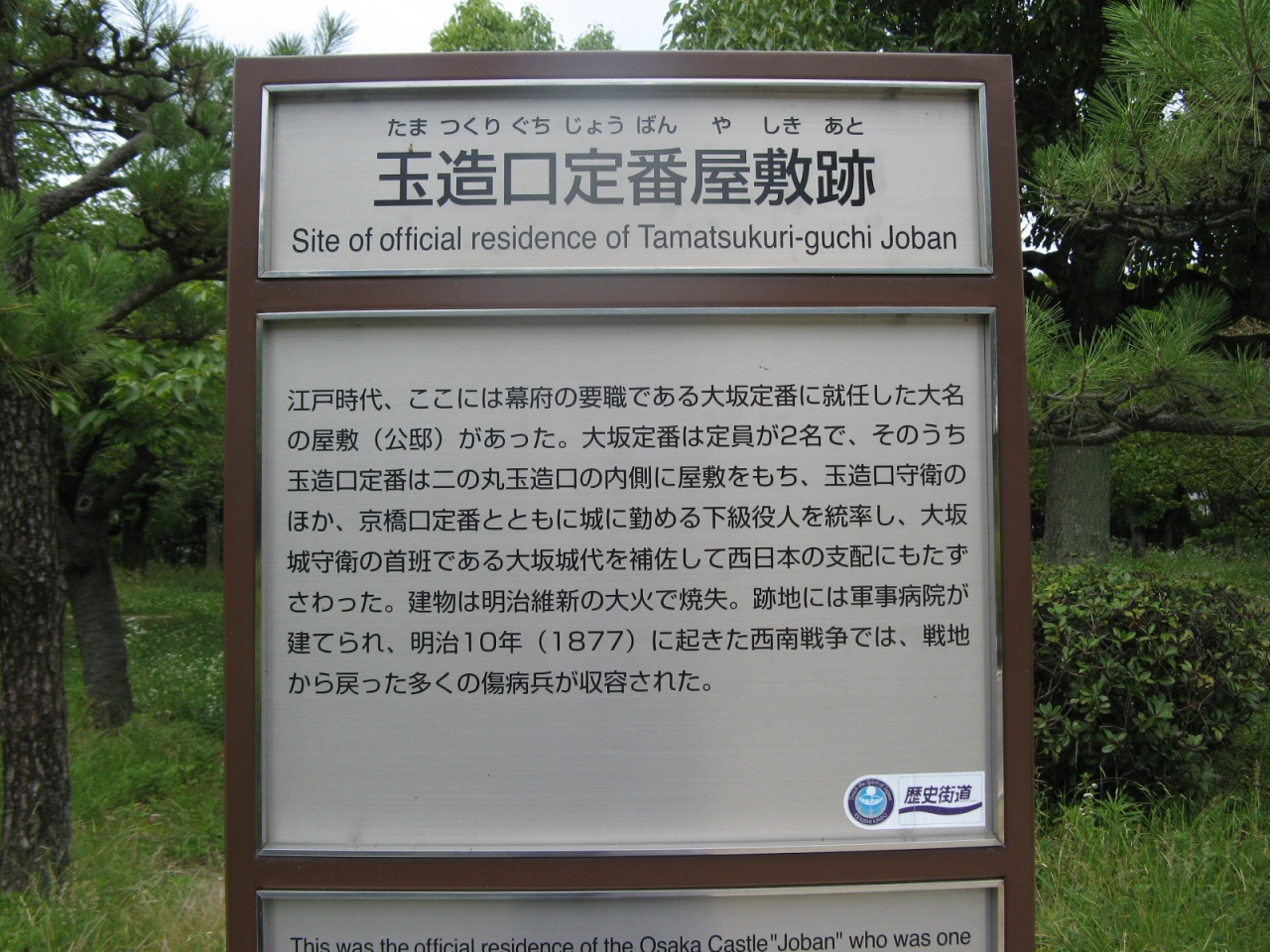 大坂城の東側にある玉造口から入ってすぐのところにあります。幕府の要職である大坂定番に就任した大名屋敷(公邸)があったところです。建物は全て戊辰戦争時の火災で焼失し、現在は樹木の茂る一角に説明板が立っているだけで観るべきものは無く、ほとんどの人は気付かずに通り過ぎるようなところです。
