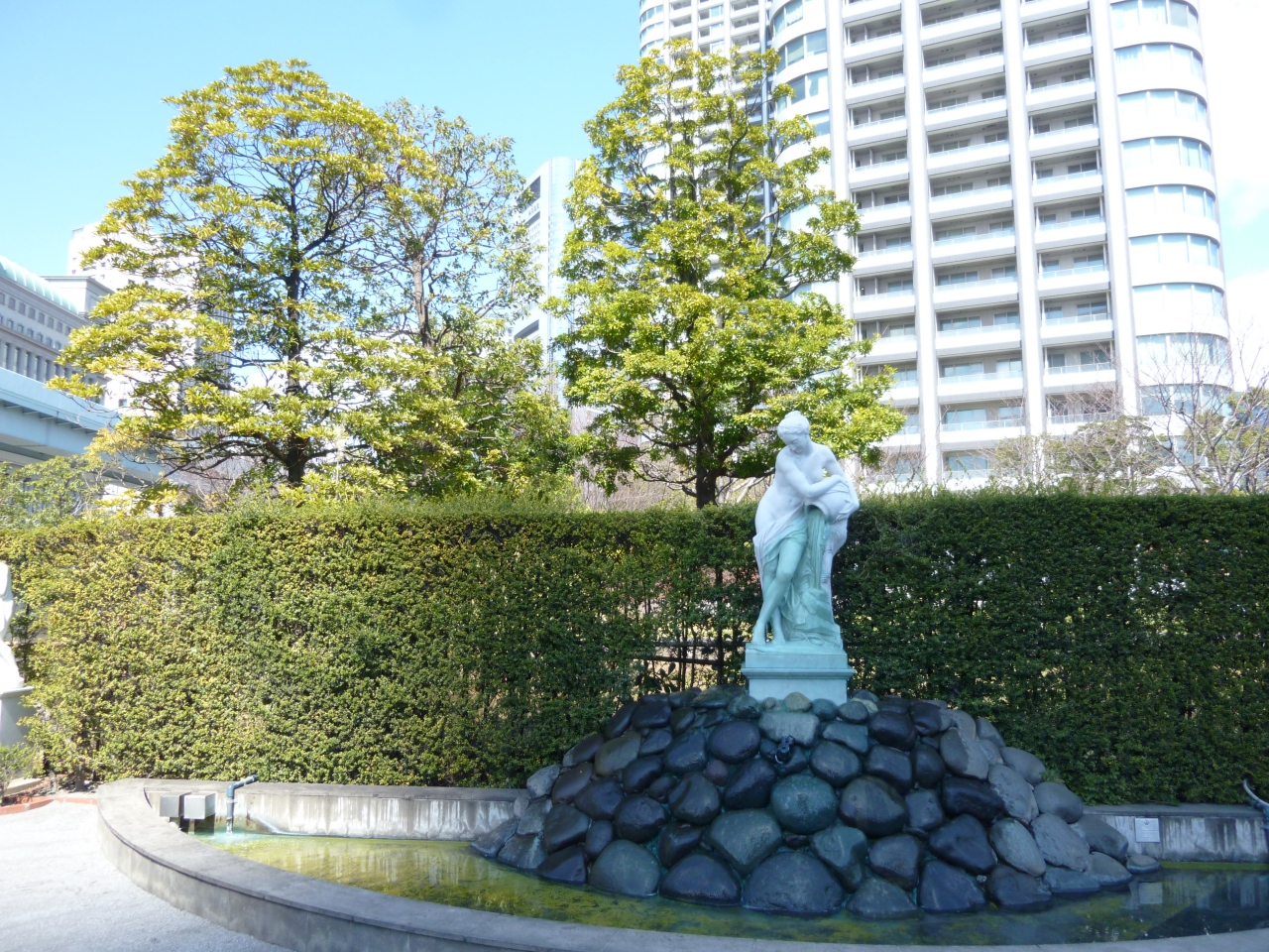 浜離宮の丁度向かい側に有りJR各線&新幹線の線路と首都高速都心環状線の間に挟まれた横長い公園になり真ん中には整備された広場に花壇、所々に洋風の人物像の彫刻が設置されています。