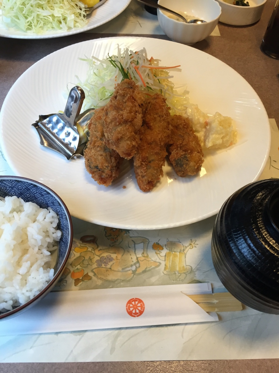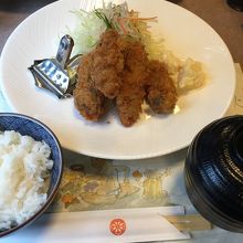 入店時からお店の方の対応が良く良い印象でした。遅いランチで伺いました。すぐに案内されカキフライ定食をオーダーしました。身がしっかりしたカキフライが4つと付け合わせのサラダとポテトサラダ、ごはんとお味噌汁とお新香つきです。ソースの他にタルタルソースも付いていて美味しかったです。
