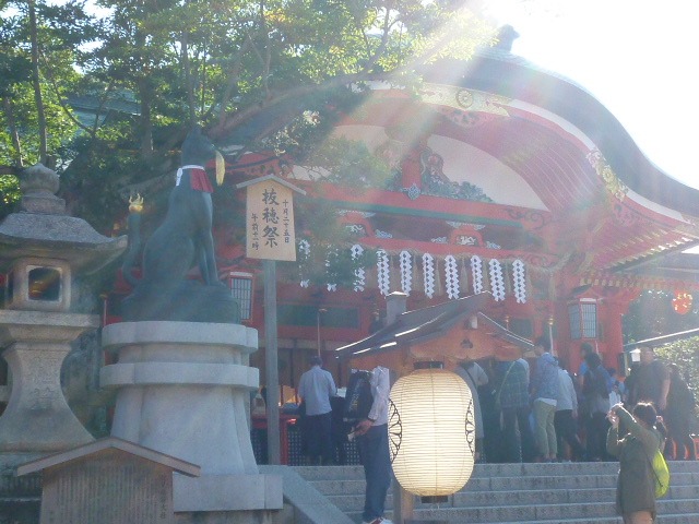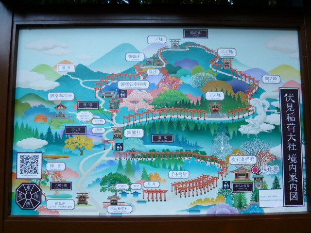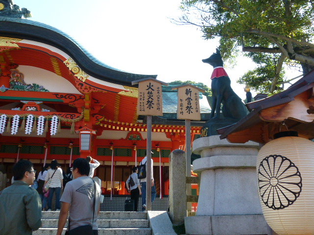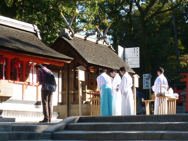 長い歴史をもつ「伏見稲荷大社」は、2011年ご鎮座1300年を迎えられました。全国に約3万社にものぼる「稲荷神社の総本宮!」は国内外からの参拝客に人気の観光スポットですね。想像以上に広い境内なので焦らずゆっくり社巡りしましょう。楼門をくぐり本殿へと進みます。いよいよ神様に願いを奉げる場所です。「内拝殿」の奥に「本殿」があり、応仁の乱で焼失し、約510年以上前に再建され、現在は重要文化財に指定されています。先ずは内拝殿です。内拝殿は唐破風屋根が特徴的です。そして「本殿」は前方の屋根が反り立ちながら庇まで伸びた形になっていて桧皮葺(ひわだぶき)五間社流造り(ごけんしゃながれづくり)で、独特な稲荷造りと呼ばれ艶やかな彫刻が施され ていています。 初詣には 、ここが多くの参拝客でにぎわう所です。お賽銭を投げて鈴を鳴らして2礼2拍手1拝で参拝です。