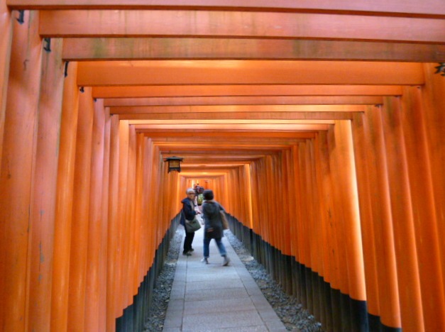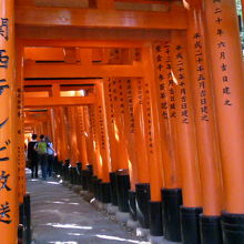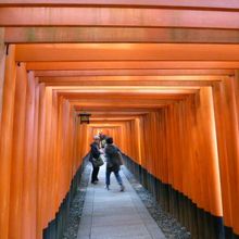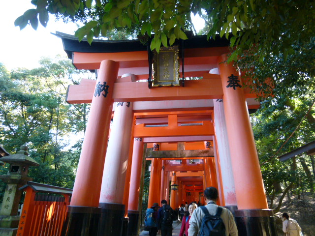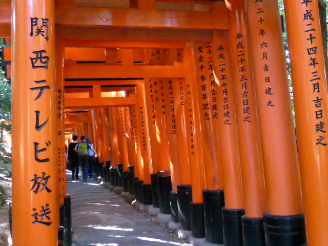 長い歴史をもつ「伏見稲荷大社」は2011年ご鎮座1300年を迎えられました。お参りを済ませたら、本殿後ろの山の方角に進むと朱色の鳥居がたくさんご覧いただけます。ここの鳥居は何故たくさんあるのか疑問でしたが実際に伺って判りました。それは三越日本橋本店の屋上に立っている稲荷神社(三囲神社)に関わりがあり、約300年程前に江戸時代中期に江戸に三井越後屋という呉服店がありました。当時は店を切り盛りしていたのが創業者の次男・三井高富でした。商売順調であったが同業者からの嫌がらせに悩んでいた時、お稲荷さんに祈り続けていた所、店の悩み事が消え去り客も増え現在まで発展し続けることができました。そして伏見稲荷大社の姿を大きく変え、この 千本鳥居はお参りに来た人が、願いが叶った、通ったと、お礼の意味から鳥居を奉納するようになったそうです。その数なんと推測ですが10,000基と言われています。千本鳥居が誕生の秘話を知る機会を得て、くぐり抜けると極楽浄土に行ったような別世界が味わえ心が浄化されました。