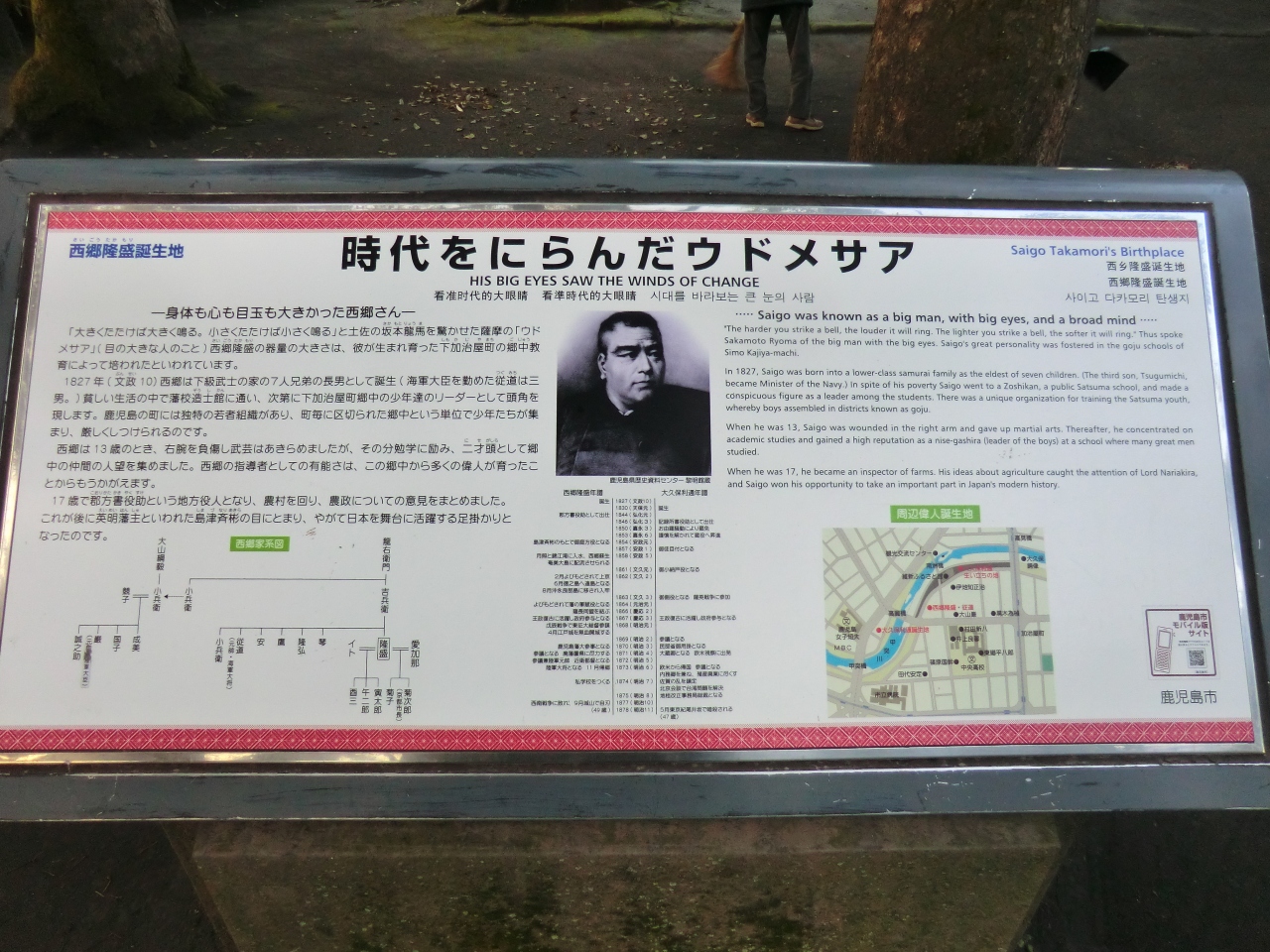 甲突川沿いの「維新ふるさと館」近く、加治屋町の公園の中に、楠の木々に囲まれて、「西郷隆盛君誕生の地」と書かれた石碑があります。弟の西郷従道邸の庭石もありました。早朝、訪れた際、町内の方々が大勢、公園の清掃をされていました。思わず私も参加してきました!