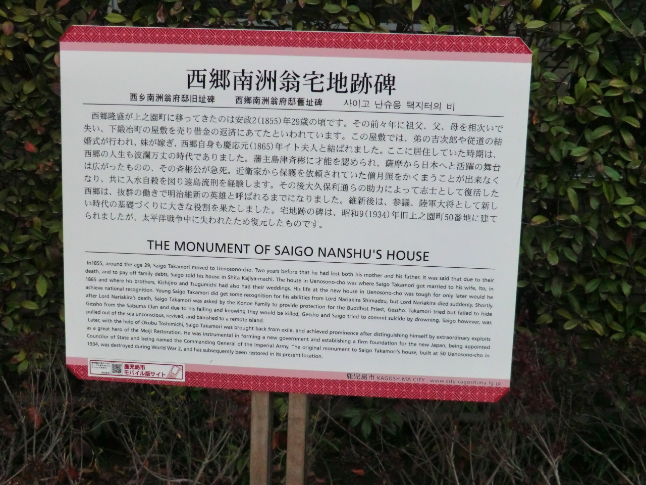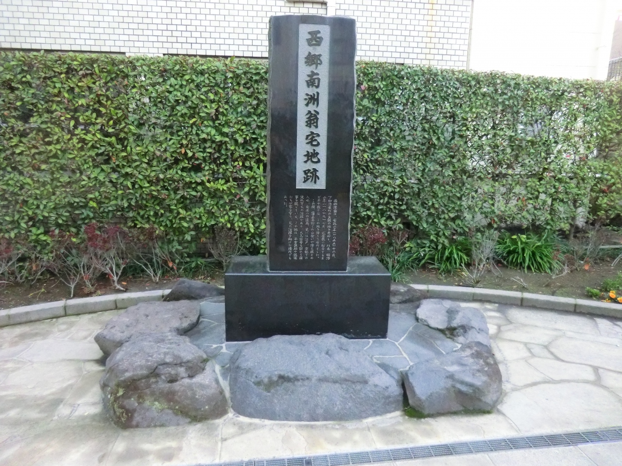 JR鹿児島中央駅から通称「ナポリ通り」を徒歩で東に約8分の所に「共研公園」があります。この公園に「西郷南洲翁宅地跡」の碑があります。西郷さんが29歳のときに加治屋町の屋敷を売り払い、ここに移ったようです。泊まったホテルのすぐ横にありました。碑が建っているだけです。