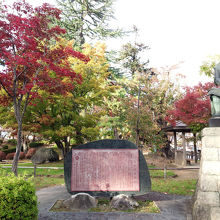 米沢城跡のお堀を渡ってすぐ近くの場所ににたっていて、楓の葉が赤く染まりとてもいい雰囲気でしたが。