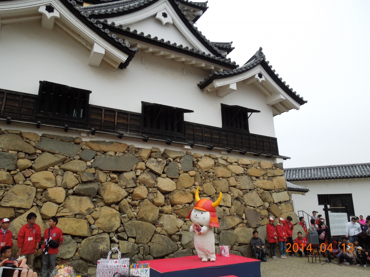 翌日ふたたび朝一番で訪れ、桜も城跡も玄宮園も十分に堪能しました。ひこにゃんの誕生日だとかで、天守の下で誕生パーティが行われました。これもいい年して並んで楽しみましたよ。ひこにゃんはカワイイなー!!